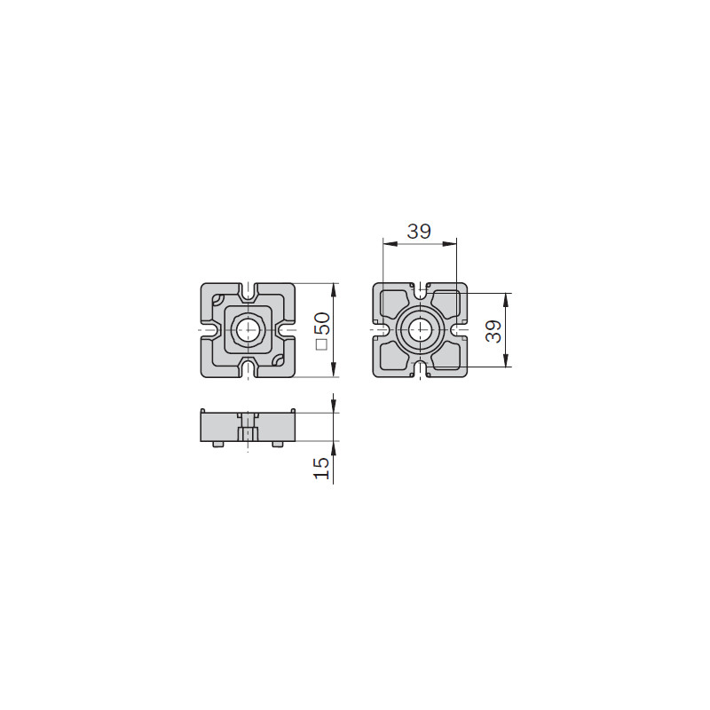 Giunto a T per profili in alluminio 50x50 mm, con scanalatura da 10 mm.