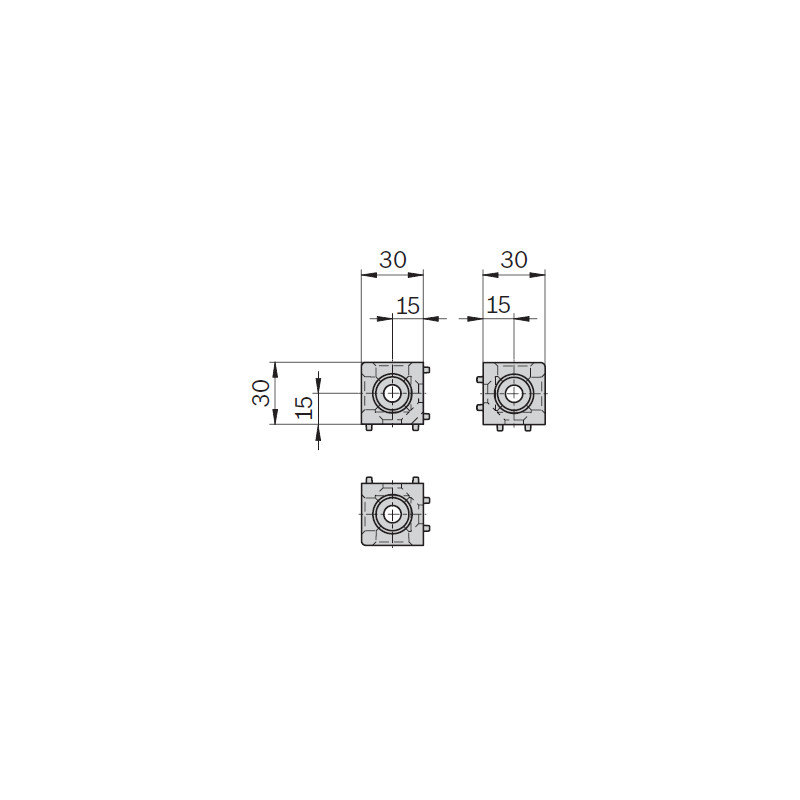 Giunto cubico per profili 30x30 con scanalatura da 8 mm.