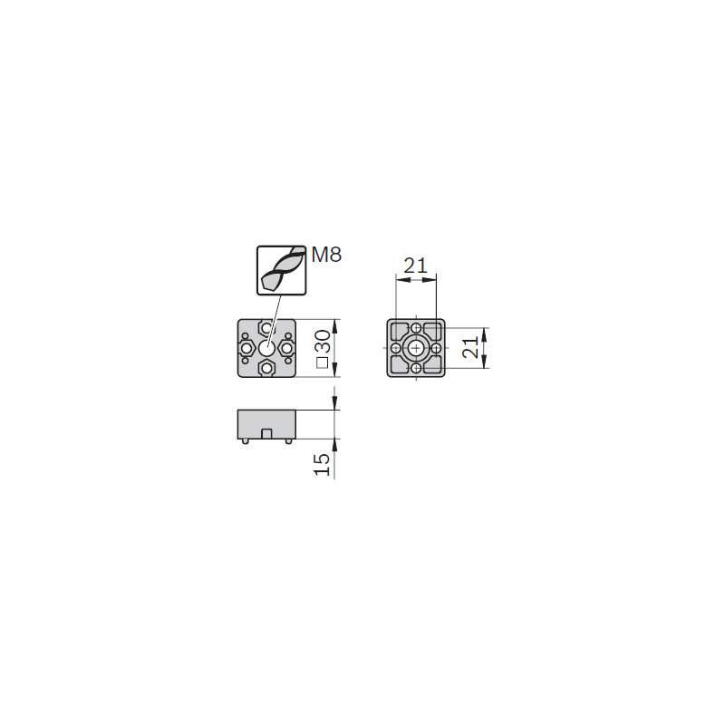 Giunto a T per profili in alluminio 30x30 mm, con scanalatura da 8 mm.