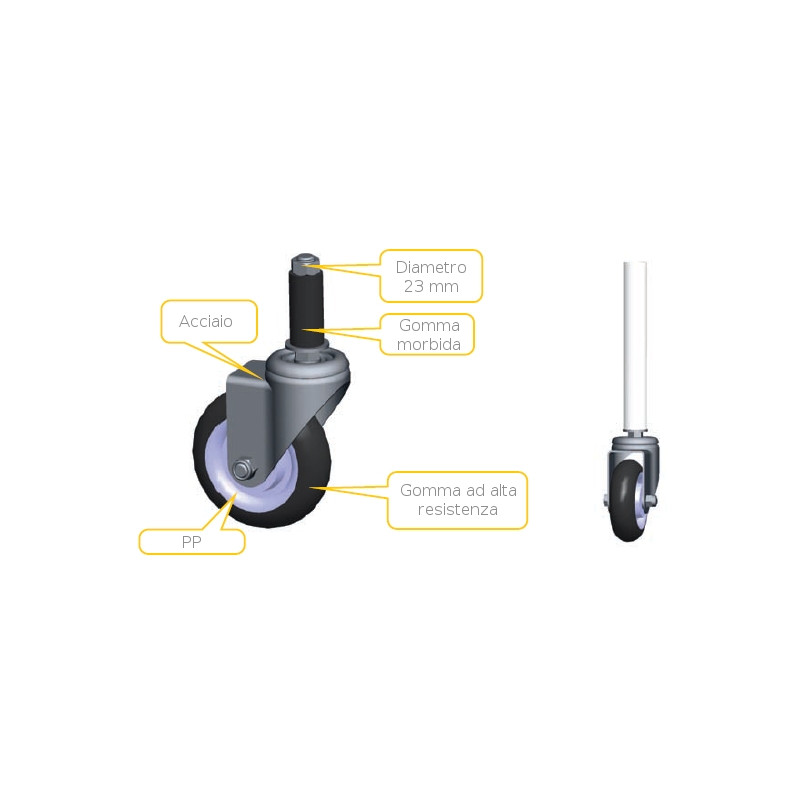 | Materiale | Supporto: acciaio zincato, cerchione: PP, pneumatico: gomma alta resistenza |