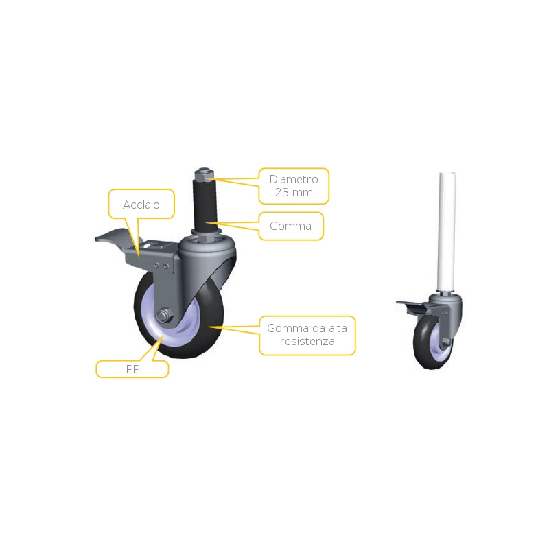 | Materiale | Supporto: acciaio zincato, cerchione: PP, pneumatico: gomma alta resistenza |