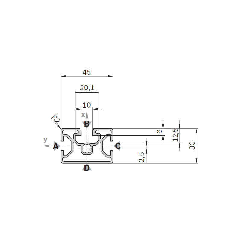 Profilo in alluminio anodizzato Bosch Rexroth, scanalatura 8 mm, sezione 30x45 mm.