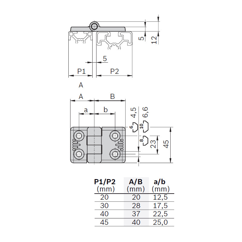 Cerniera in alluminio per profili con scanalatura 6, 8 e 10 mm.