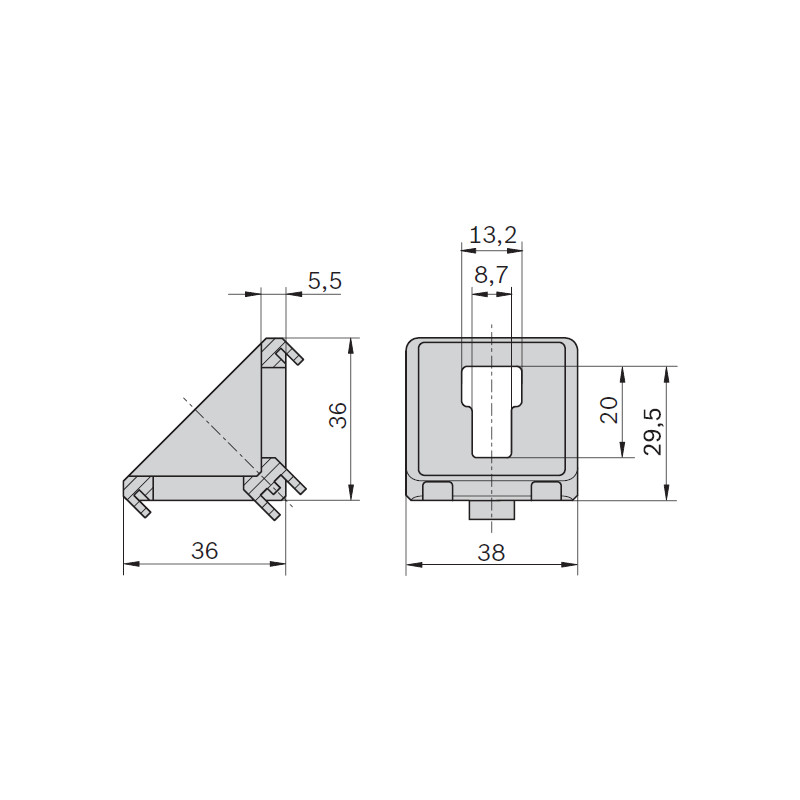 Squadretta angolare flangiata per profili 30x30 con scanalatura da 8 mm.