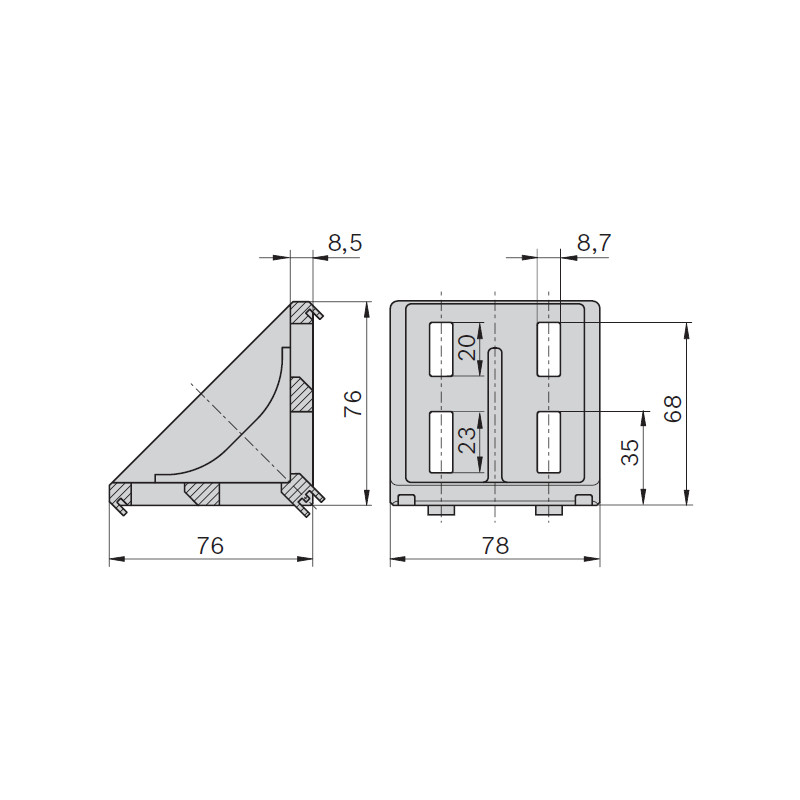 Squadretta angolare per profili con scanalatura da 8 mm e da 10 mm.