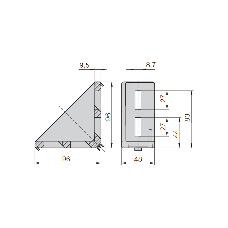 Squadretta angolare per profili con scanalatura da 8 mm e da 10 mm.
