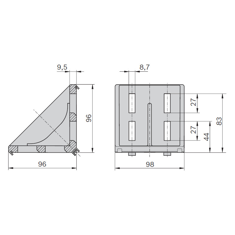 Squadretta angolare per profili con scanalatura da 8 mm e da 10 mm.