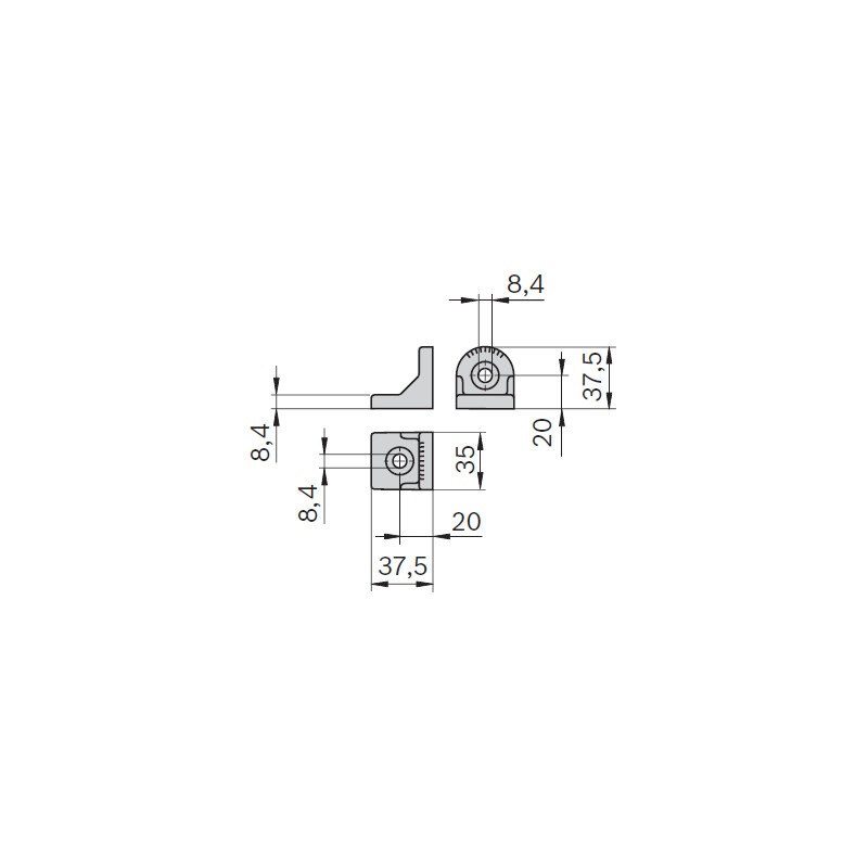 Squadretta angolare R 35x38 mm per profili con scanalatura da 8 mm e da 10 mm.