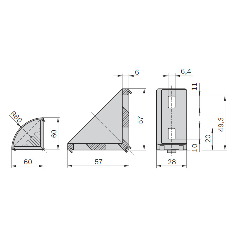 Squadretta angolare 30x60 mm per profili con scanalatura da 8 mm.